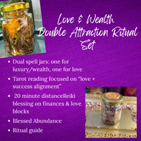 Designed for high-achieving spiritual clients who desire both deep love and abundant success, this luxurious ritual set is your portal to alignment and manifestation. You'll receive dual handcrafted spell jars—one for wealth and luxury, the other for radiant love—each charged with intentional energy. A personalized tarot reading will illuminate your unique path to love and success alignment, while a Reiki blessing clears energetic blocks around both money and relationships. To amplify your magnetic aura, Blessed Abundance Anointing Oil. This elevated experience is completed with a ritual guide, making this not just a ritual—but a transformation.