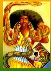 THIS is the version of Sta Marta that I venerate and have an altar dedicated to. Filomena Lubana is a Voudou Loa who was synchronized with the Christian Saint after the African Diaspora. Her statues feature her with snakes wrapped around her and a small child at her feet. She saved a young boy from harm when he was surrounded by snakes and about to be eaten. She defeated the snakes and raised the boy as his own.