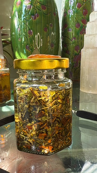 Each jar is filled with anointed and prayed over herbs, roots and crystal. Your expertly crafted petition paper will contain yours and your loved ones names. This jar contains 10 herbs, roots and crystals.